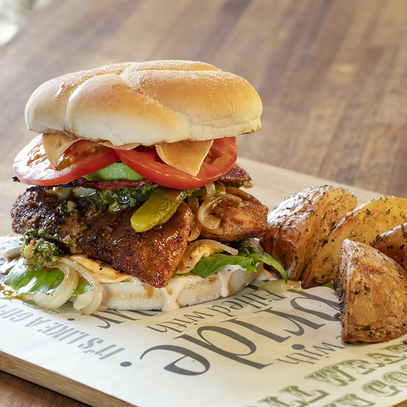 180g Grilled chicken breast on a freshly baked bun with a base of greens, tomato, pickled peppers, cucumber, and caramelised onion.
