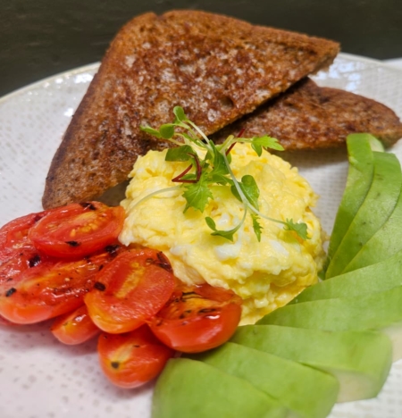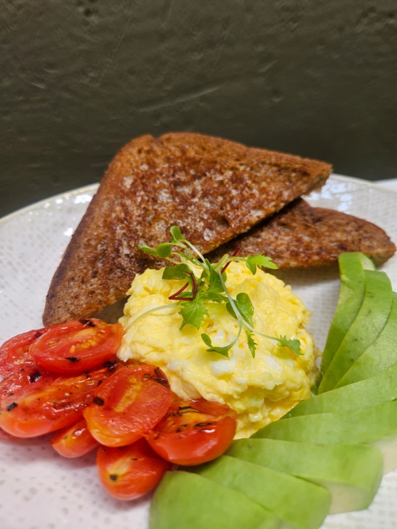 Three scrambled Eggs served with a slice of White, Brown, Wholewheat or 100% Rye Bread